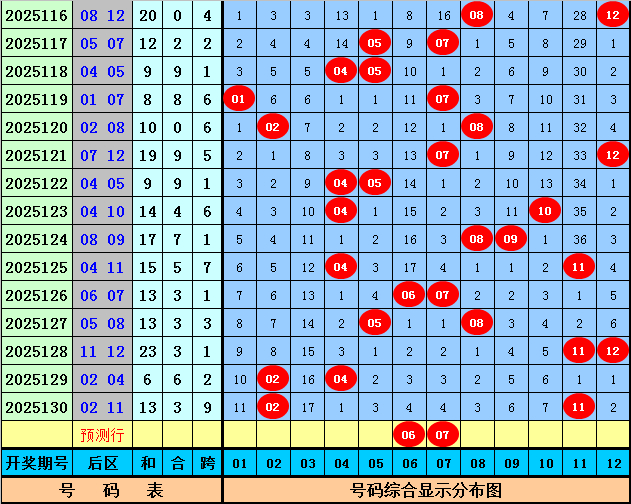 前区尾数质合分析:上期前区包含3个质尾奖号:01、13、27,开出2个合尾奖号:16、29,最近10期前区奖号质合尾数个数比为24:26,质合尾数奖号出现比例相当,本期预计合尾奖号热出,看好合尾奖号出现3个。