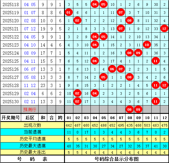 和值跨度:上期和值开出86,对比第2025129期和值下降了3个点位,本期看好和值走小,关注小 号区域和值,预计在88附近。